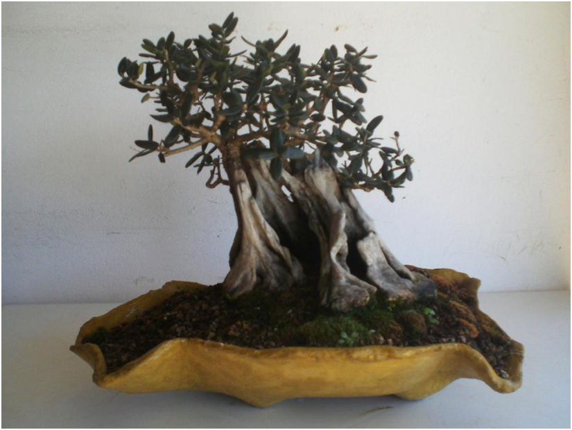 Il primo passo per me è quello di tornare in quei campi che conosco e cercare con la mente una forma, un indizio, un dettaglio, per creare un’ immagine che   poi cerco  di trasferire al materiale che ho a disposizione,  in modo che il mio futuro bonsai sia una possibile rappresentazione di quelle piante. Con un materiale di questo genere posso immaginare un olivo  adulto (70/80 anni), ma non secolare: devo quindi ottenere una pianta con una ramificazione sviluppata e una massa verde importante.Ho iniziato applicando il  principio che suggerisce di eliminare tutto quello che sicuramente non rientra nel disegno ideale del  bonsai; pertanto,ho eliminato i due monconi presenti all’apice della pianta, non essendo utilizzabili. Dopo questa operazione ho atteso che si sviluppasse la massa verde. Attraverso vari stadi di lavorazione, sia sul tronco che sul verde,sono passato dalla condizione  inizialea quella della foto sottostante che non  può essere definita  dirittura d’arrivo ma un buon viatico.Mettendoci un pizzico di presunzione, a mio avviso, il risultato ottenuto è buono, mi incoraggia, ma il cammino non è ancora concluso.